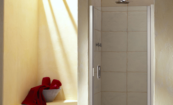 Instead of a heavy glass shower door, Heartland Glass designed a new door layout using a semi-frameless door and extended jamb. The door was now able to swing through and avoid the toilet completely.